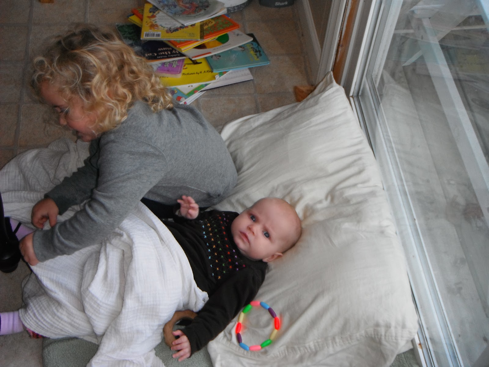 With Bunny being more sleepy lately, due to the time change, she has enjoyed playing "rest time" she get blankets and pillows and books and declares that she is tired and going to "peep".