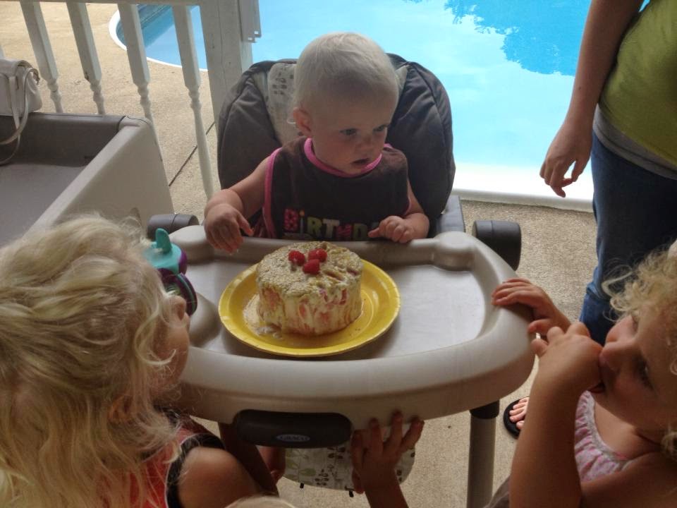 It is actually watermelon! I cut a "cake" out of a watermelon and iced it with coconut milk cream (in the fridge, the thicker cream rises and you can spoon it off the top). the I just added berries and almonds and some organic sprinkles on her little cake. It was pretty good. Though I think next time I will make a jello mold using grass fed gelatin and organic juice, then ice and decorate that.